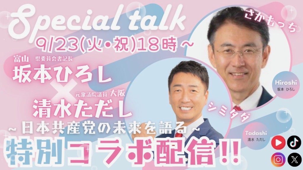 「清水ただし×坂本ひろし」のライブトークを予定しています。清水ただしさんのSNSアカウント(Xやティックトック等)で配信しますので、フォローをお願いします。